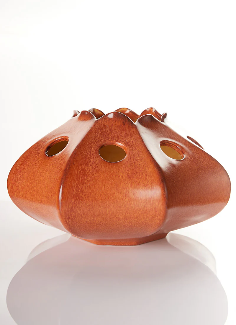 The arcs, curves, and ridges provide an excellent canvas for the rich and sumptuous glaze that is silky to the touch and not too overtly glossy. Visually, it presents as a refined blending of rich, Golden Ochre that is feathered with deep sienna, giving additional depth. Take a step back to view this piece as a whole and the effect resembles leather or marbled stone.