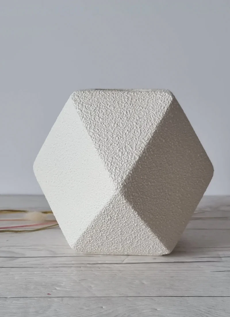 This rare and highly sculptural work of mid-century Modern art ceramic by the Italian pottery Bertoncello Ceramiche D'Arte (est. c. 1956 - c. 1999). The dramatically angled form firmly displays influences of Modernist design as well as design qualities reminiscent of Art Deco Bauhaus geometricism. The overall shape is that of a 14-sided prism, with each angled 'face' culminating into a seemingly simple shape that would become an excellent feature as an Ikebana arrangement. The sumptuously applied and lightly textured glaze is called the Sasso Bianco or, 'White Stone' that creates depth with shadows from the angles. The combination of the form, glaze, and condition makes this piece a rare find.