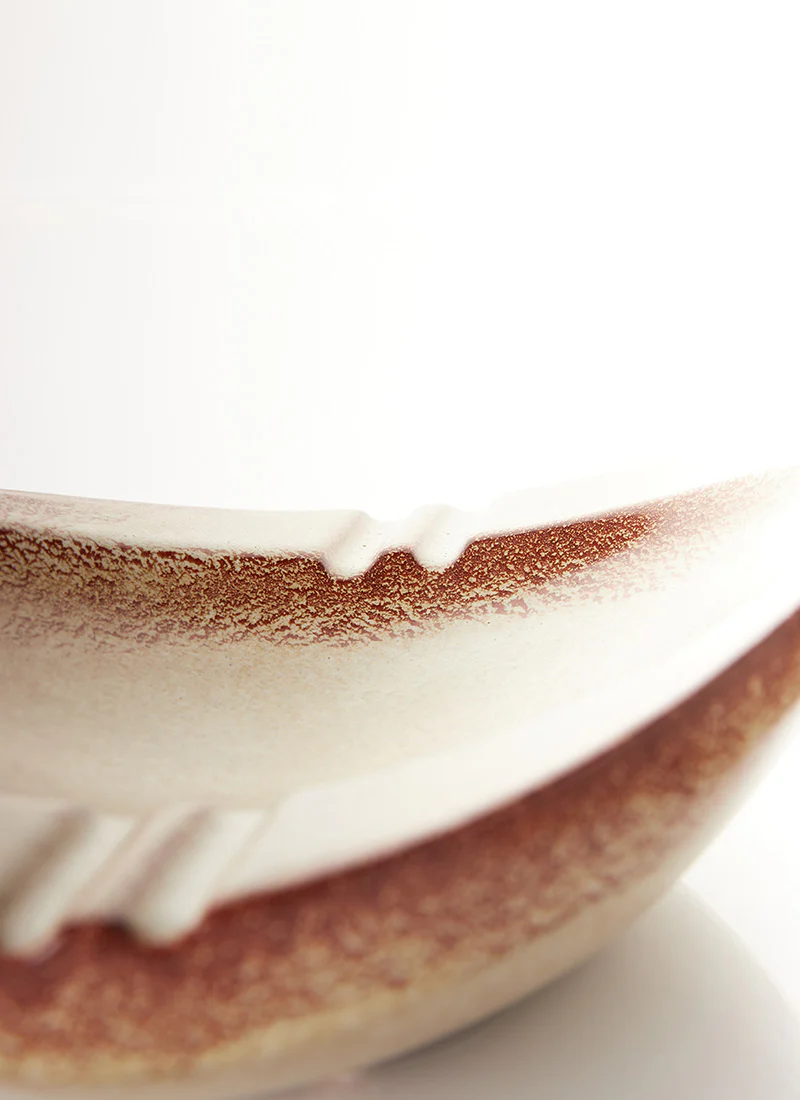 Further elevating this piece is the sumptuous glaze that is immensely silky and invites touch. The glaze is one of two Bertoncello signature glazes and visually presents as a refined blending of rich, Vanilla Cream that is feathered with deep sienna, giving additional depth. Take a step back to view these pieces as a whole and the effect resembles leather or marbled stone.