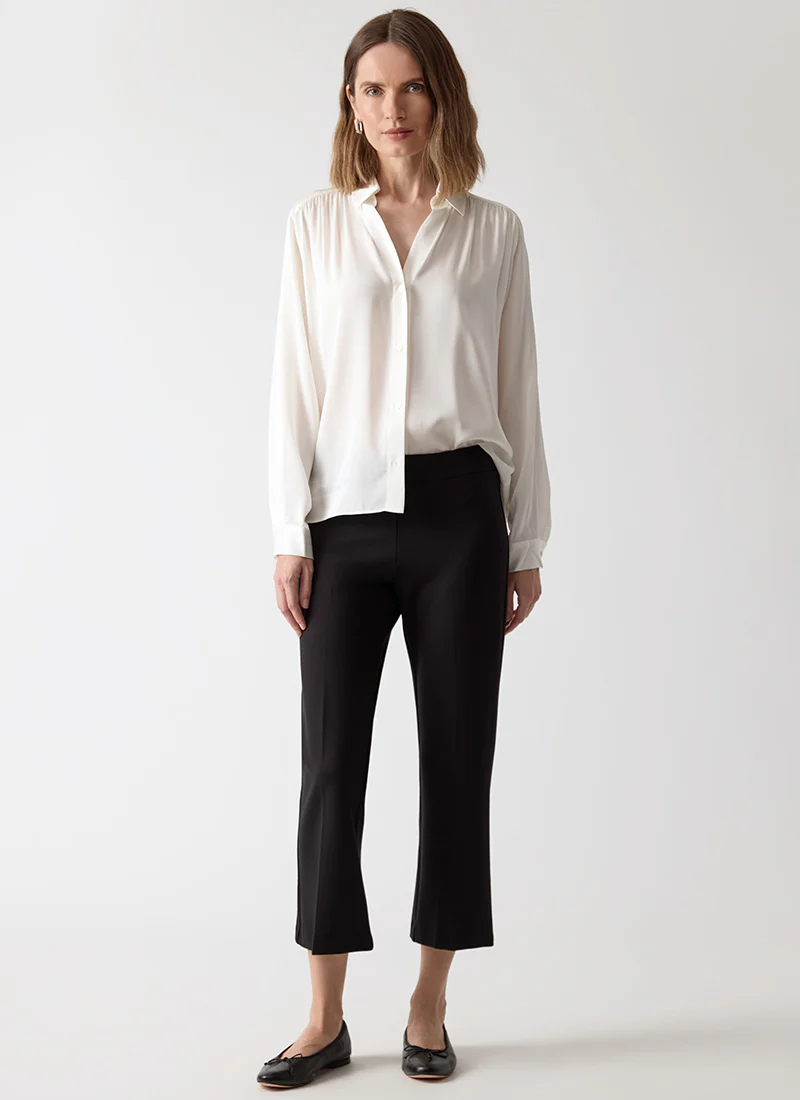 The Leo Signature Crop Flare Pant by Avenue Montaigne features a flattering cropped flare cut and a pull-on elasticated waistband for ultimate comfort. Crafted from the brand's signature stretch fabric, these versatile pants pair effortlessly with heels, sneakers, loafers, or boots, making them a year-round essential.