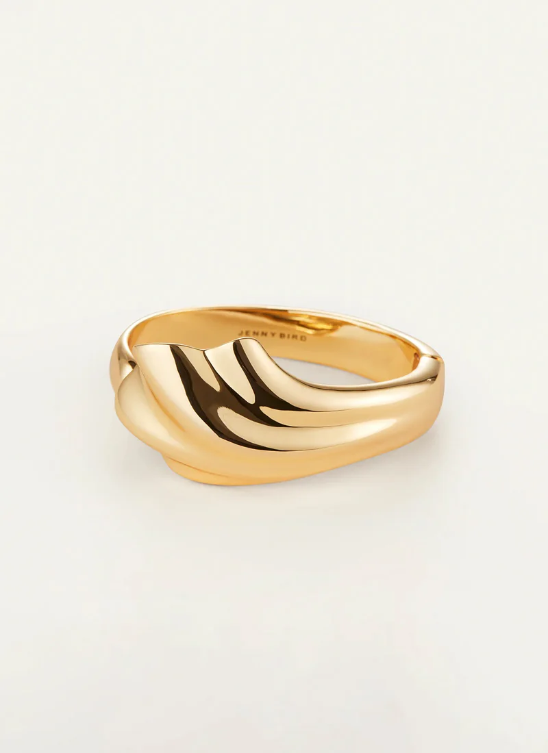 The Lydia Cuff by Jenny Bird at Andrews is a sculptural statement piece inspired by the flowing contours of a seashell. Cast in high-polish gold, this hinged bracelet opens seamlessly with an elegant lift-and-release mechanism, making it as functional as it is striking. Pair it with a crisp white button-down and wide-leg trousers for a polished, modern look.