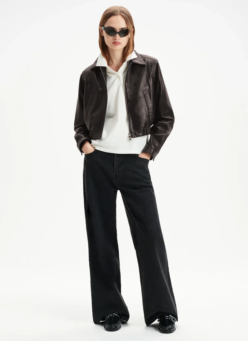 The Essie Recycled Cropped Jacket by AGOLDE at Andrews is a striking black jacket with a contemporary cropped fit. Crafted from sustainably sourced leather, it features sleek lines, refined seams, and a gathered hem for a polished yet effortless finish. Pair it with high-waisted jeans or tailored trousers for a modern wardrobe essential.