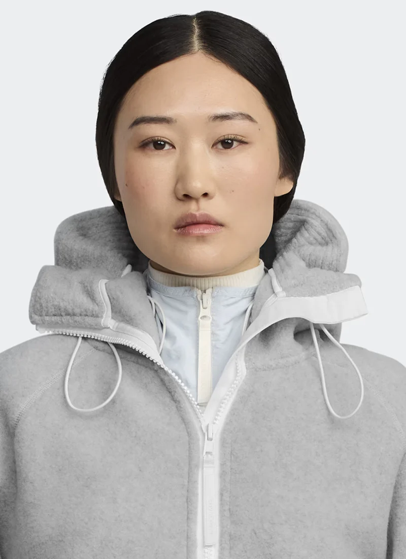 The Chilliwack Fleece Bomber by Canada Goose at Andrews is a masterclass in comfort and sustainability, crafted from Kind Fleece to keep you warm while caring for the planet. With a relaxed silhouette, adjustable snorkel hood, and reinforced high-abrasion areas, it’s built for effortless everyday wear. Pair it with tailored trousers or sleek joggers for a modern, elevated look.