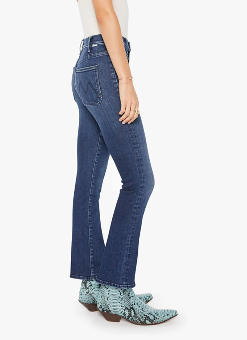 The Patch Pocket Insider Flood by MOTHER at Andrews brings playful sophistication to everyday denim. Crafted from premium stretch denim in the rich You're A Riot wash, this high-rise bootcut silhouette features vintage-inspired patch pockets, soft whiskering, and a flattering cropped length. Pair it with a silk blouse and leather mules for effortless polish.