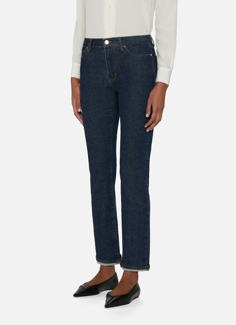 The Borrowed Straight Leg Jeans by FRAME at Andrews are the ultimate update on a timeless boyfriend silhouette, crafted from Structured Stretch denim that offers both a vintage look and modern comfort. Designed with a mid-rise waist and ankle-grazing inseam, they flatter the hips while allowing versatile styling. Pair them with a crisp cotton button-down and a sleek loafer for effortless polish.