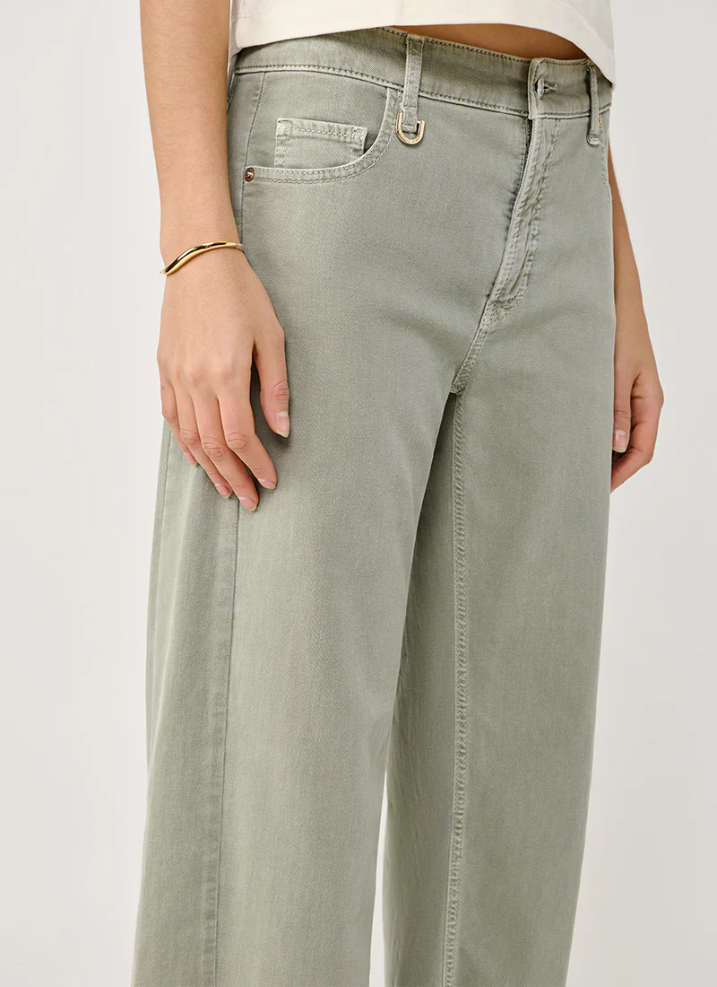The Oria Wide Leg Jeans by Cambio at Andrews offer a modern twist on classic denim with a flattering O-shape silhouette and mid-rise cropped fit. Crafted in soft faded green denim, they feature elegant gold D-ring detailing and a timeless 5-pocket design. Pair them with a crisp white blouse and sleek ankle boots for a refined, effortless look.