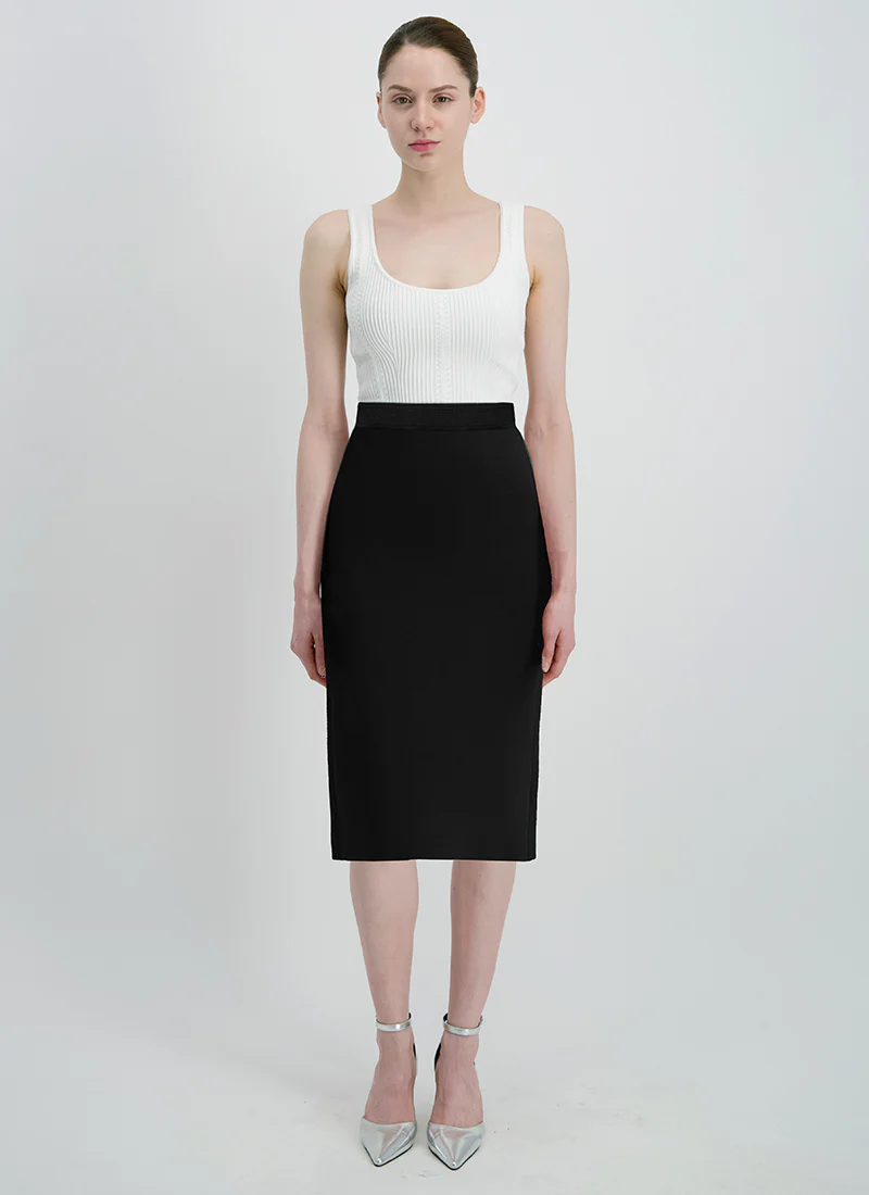 The Tess Pencil Skirt by RVN at Andrews is a high-waisted pull-on skirt in stretch knit, designed with tonal stitch detailing that subtly defines the waistband. Its sleek, sculpting silhouette effortlessly enhances your natural curves. Pair it with a crisp blouse and pointed heels for a polished office-to-evening transition.