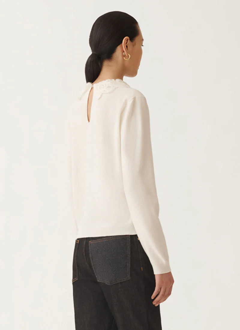 The Lace Collar Crew Neck Sweater by Fabiana Filippi at Andrews is crafted from Platinum yarn, a refined blend of wool, cashmere, and silk that offers unmatched softness and warmth. This boxy silhouette is elevated by delicate macramé lace at the collar, adorned with subtle nugget detailing, inspired by Alberto Burri’s Combustioni. Pair it with tailored trousers or a sleek midi skirt for a sophisticated, modern look.